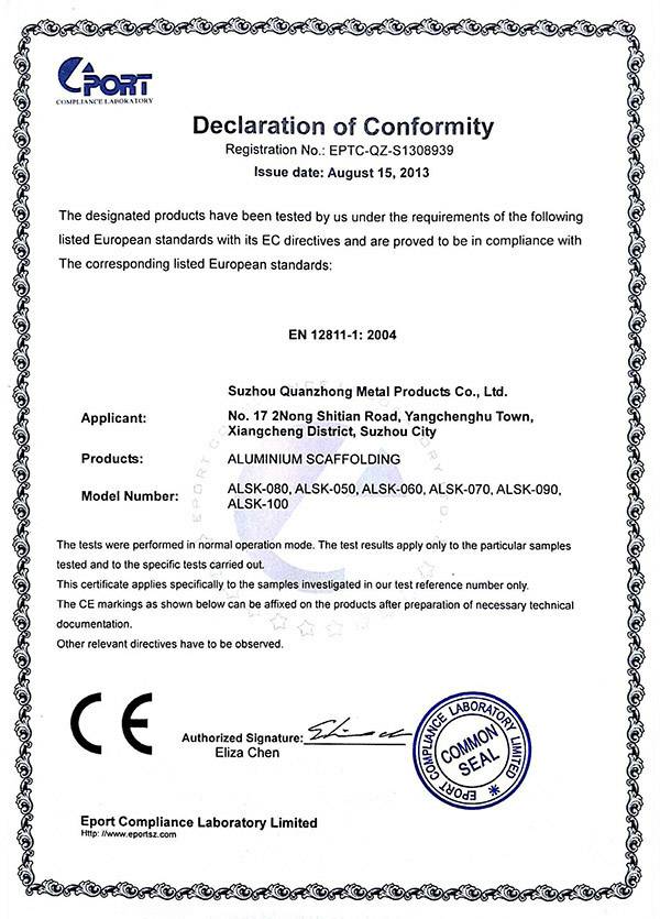 完美体育·完美登陆入口-完美online(中国)专注铝合金制品的开发“产品就是人品”的企业理念,不断进行技术创新、设备创新、服务创新、和管理方式创新来继续研发出更多满足未来发展需要的产品, 公司产品通过欧盟认证取得CE认证并取得证书,铝合金脚手架系列产品通过SGS认证,铝合金平台和梯具类产品均严格按照GB12142-2007,GB17888等标准设计生产。